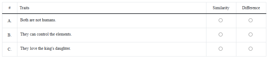 2. After reading the text, we can see that Son tinh and Thuy tinh are different, but they also have some similarities. Decide if each trait shows a similarity or a difference.