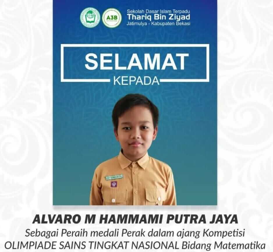 Bekasi(11/03)- SDIT Thariq Bin Ziyad Jatimulya kembali menambah capaian prestasinya di tahun 2022. Prestasi ini diperoleh dari siswanya yaitu Alvaro M Hammami Putra Jaya. Alvaro meraih juara 2 dalam kompetisi matematika tingkat nasional yang diadakan oleh lembaga Rihand Creative Indonesia pada tanggal 26 Maret yang lalu. Atas pencapaian ini Alvaro berhak mendapatkan medali perak.