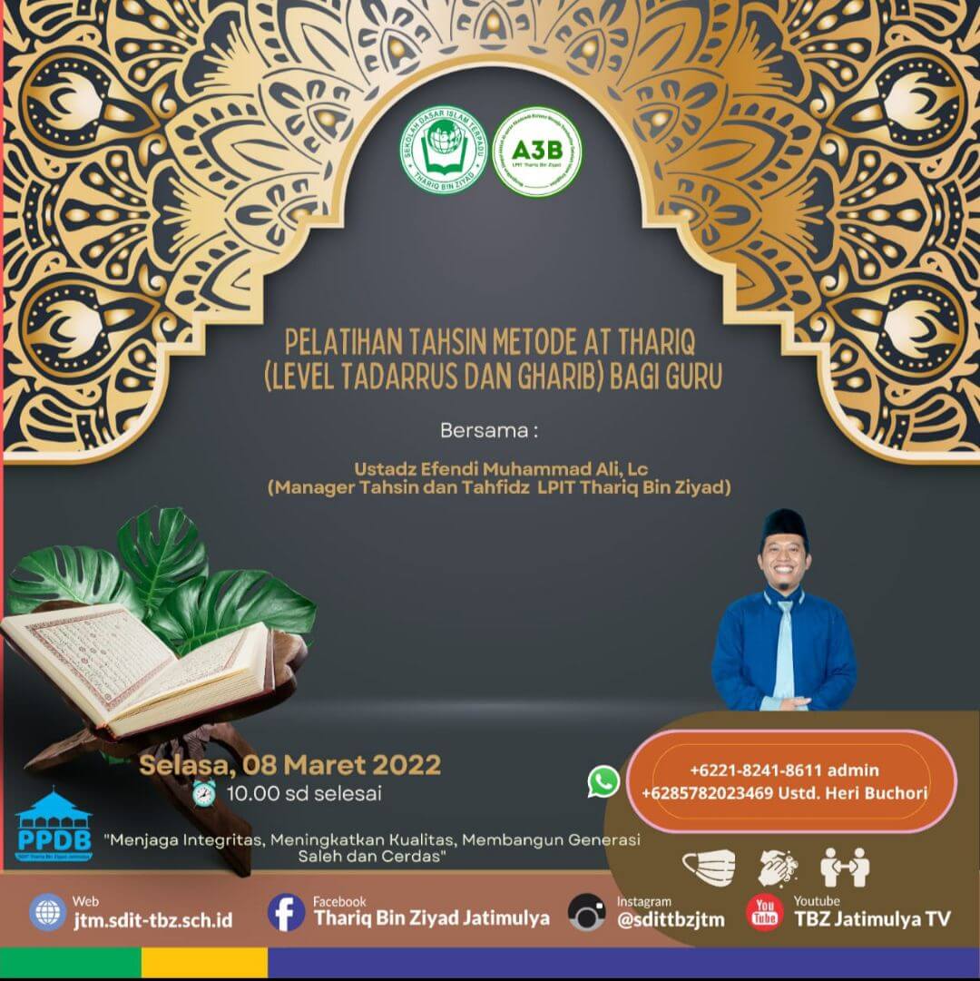 Mengingat pentingnya agenda Pelatihan Qur’an Metode At-Thariq ini maka pada hari selasa (8/3/2022) SDIT TBZ Jatimulya mengadakan Pelatihan tersebut dengan menghadirkan pembicara yaitu Ust. Efendi Muhammad Ali,Lc.