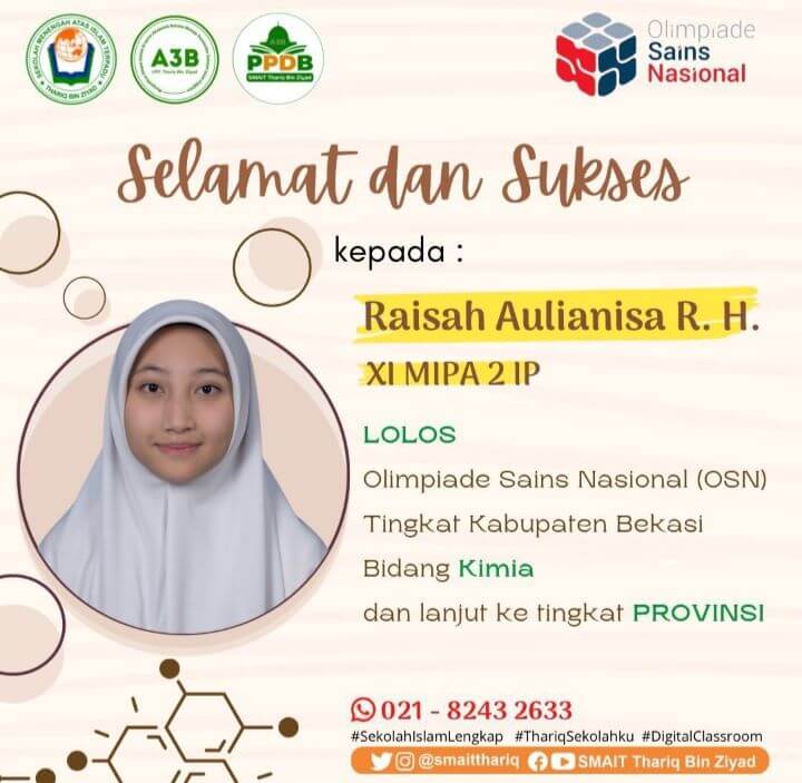 Raisah Aulianisa lolos ke OSN tingkat provinsi Jawa Barat dengan menduduki peringkat ke 3 Bidang Kimia dari Kabupaten Bekasi bersama 7 (tujuh) peserta didik lainnya.