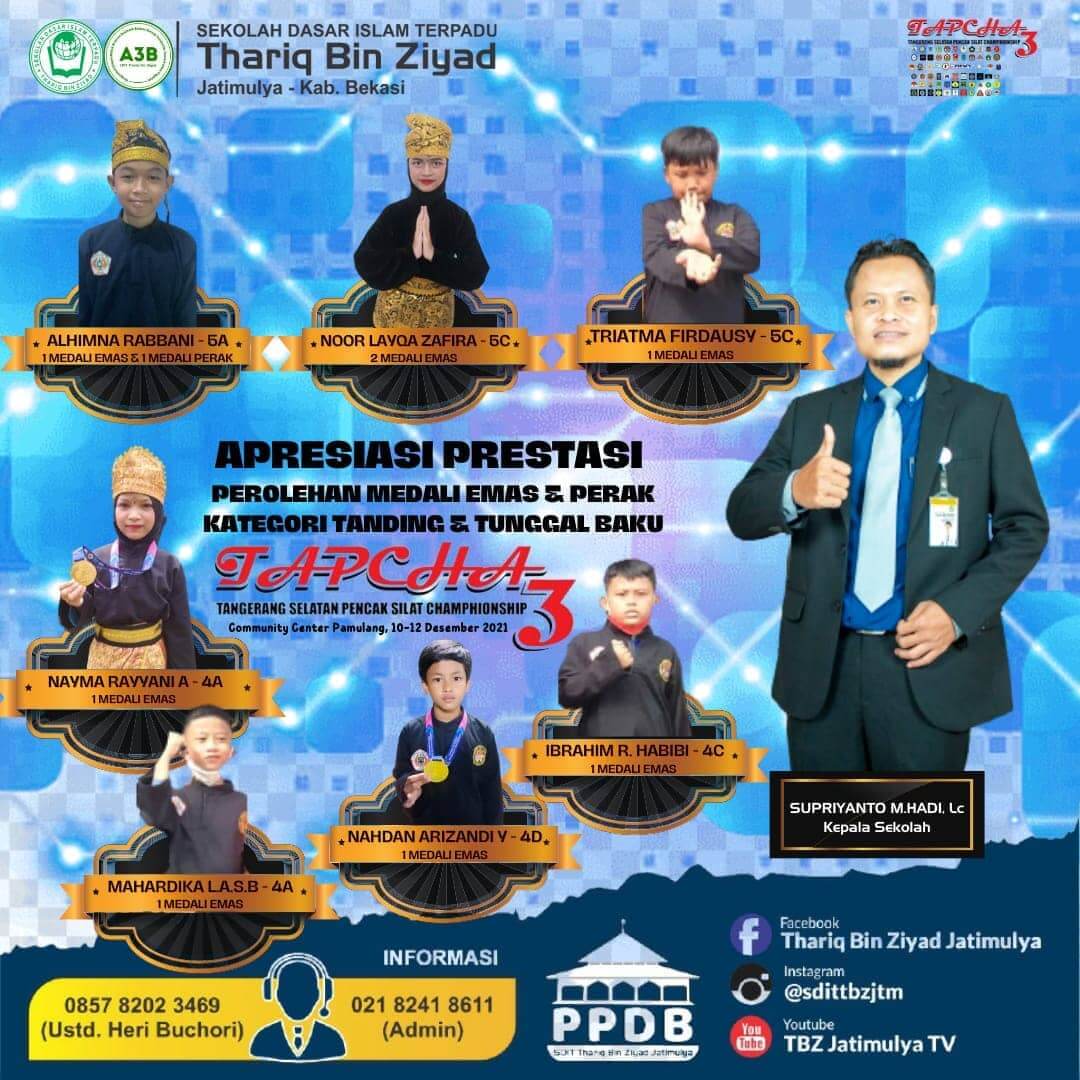 Olahraga seni bela diri Pencak Silat sudah dikenal sejak para pendahulu kita. Pencak silat bela diri warisan leluhur ini mempunyai tujuan untuk mengolah kreasi bela diri,seni dan dapat menumbuhkan rasa percaya diri. SDIT Thariq Bin Ziyad – Jatimulya melalui Program Ekstrakurikuler sudah melahirkan siswa/i yang tampil dalam kegiatan Pencak Silat dan tak jarang mereka meraih medali emas dan perak di tingkat kabupaten bahkan tingkat Nasional. Di tahun ini Siswa/i alhamdulillah berhasil meraih 8 medali emas dan 1 medali perak dalam ajang TAPCHA 3 (Tangerang Selatan Pencak Silat Championship).