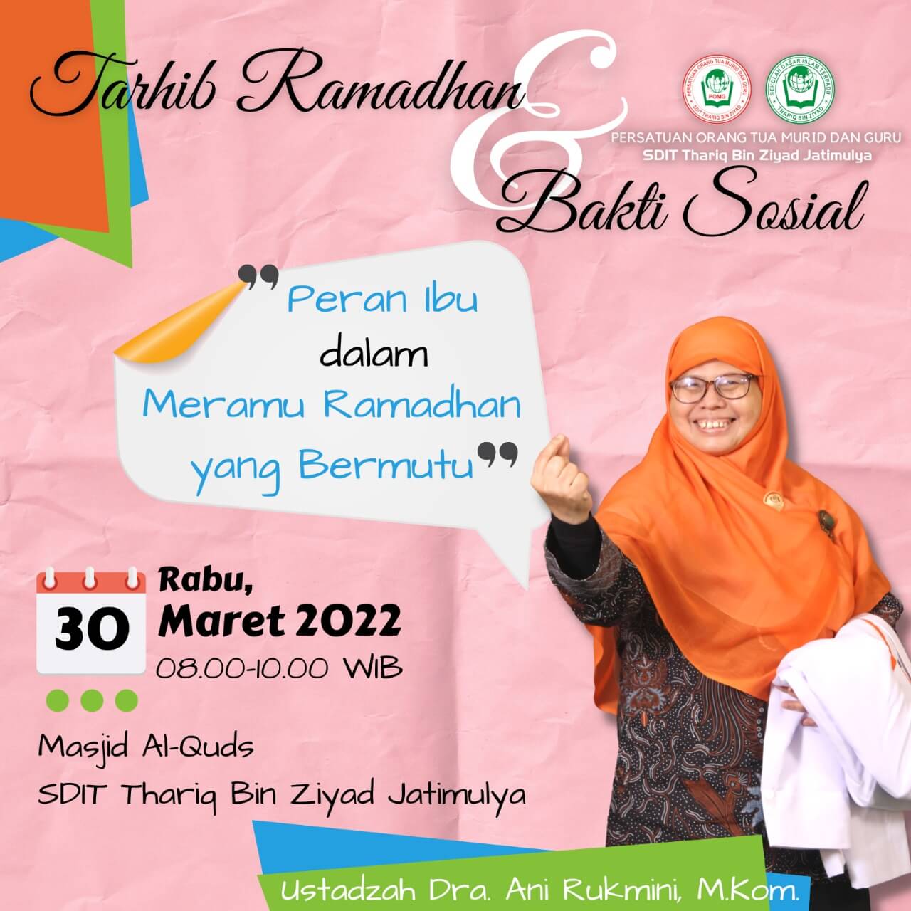 Bekasi(30/3) – POMG SDIT TBZ Jatimulya mengadakan Tarhib Ramadhan bagi orangtua peserta didik SDIT TBZ Jatimulya. Tarhib Ramadhan kali ini juga bersamaan dengan bakti sosial yang diselenggarakan sebagai bentuk persaudaraan kepada kaum dhuafa di sekitar lingkungan sekolah. Acara Tarhib Ramadhan ini menghadirkan Ustadzah. Ani Rukmini, M.I.Kom sebagai pembicara. Tarhib Ramadhan adalah kegiatan menyambut bulan Ramadhan dengan berbagai cara salah satunya kajian keislaman.